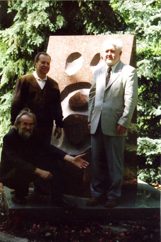Слева от Сергея Петрова: художник Александр Зинин, автор памятника (присел), писатель Григорий Медведовский (стоит), июнь 2007 г.: