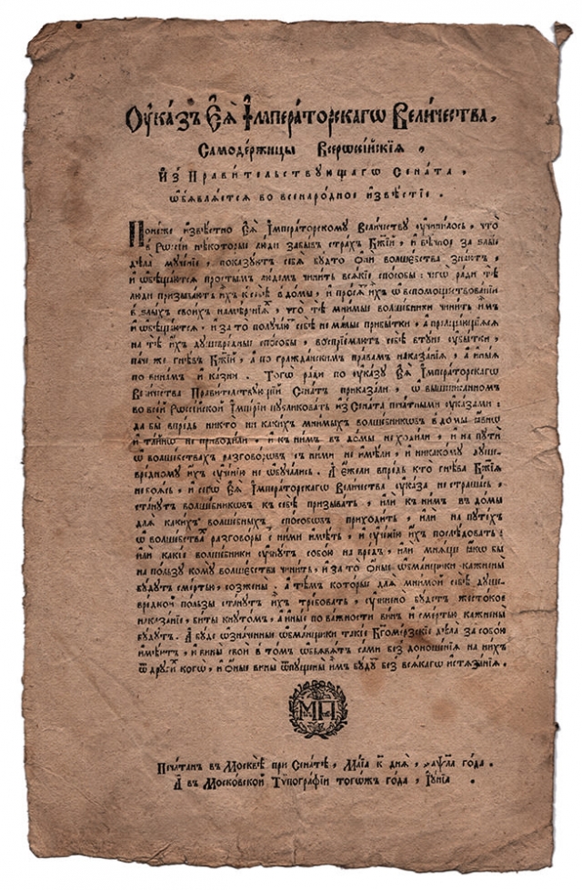 25 мая 1731 года императрица Анна Иоанновна издала именной указ «О наказании за призывание волшебников и о казни таковых обманщиков»: «В России некоторые люди, забыв страх Божий, показывают себя, будто бы они волшебства знают и обещаются простым людям чинить всякие способы, чего ради те люди призывают их к себе в дома и просят их о вспомоществовании в злых своих намерениях, что те мнимые волшебники им обещаются и за то получают себе немалые прибытки… Того ради оные обманщики казнены будут смертью, сожжены».