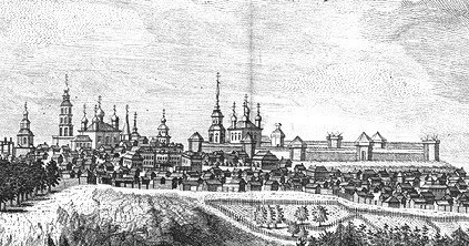 Спасский женский монастырь и Симбирский кремль на гравюре 1765 года. Между монастырем и кремлем находилась площадь, на которой был сожжен Яков Яров: