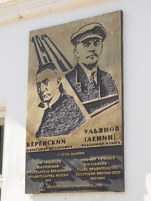 К 100-летию событий 1917 года весной 2017-го на здании Симбирской гимназии появилась мемориальная доска, увековечивающая одновременно Александра Керенского и Владимира Ульянова-Ленина. Ленин – в кепке, с фотографии, сделанной в 1920 году; Октябрьскую революцию 1917 года Владимир Ильич делал бритым и в парике. Керенский – со своей знаменитой стрижкой «бобриком». Её будущему главе Временного правительства порекомендовала первая супруга Ольга Львовна, в девичестве Барановская (1884 – 1975). С супругой Керенский впоследствии расстался, а вот верность причёске сохранил на всю жизнь.