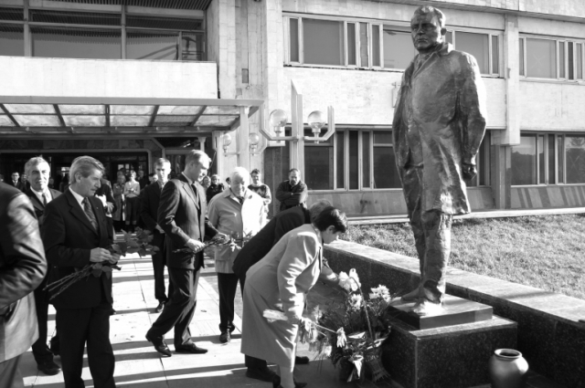 Торжественное открытие памятника первому генеральному директору Аполлону Сергеевичу Сысцову у входа в административный корпус завода. На фото возлагает цветы бывший губернатор Ульяновской области Сергей Морозов: