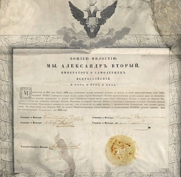 Грамота о почетном гражданстве Симбирских купцов Хапковых: