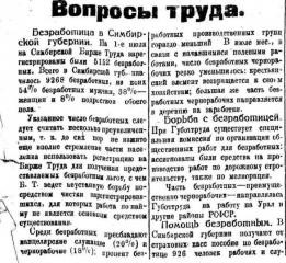 На 1-е июля на Симбирской Бирже Труда зарегистрированы были 5152 безработных. Всего в Симбирской губ. значилось 9268 безработных, из коих 54% безработных мужчин, З8% - женщин и 8% подростков обоего пола.