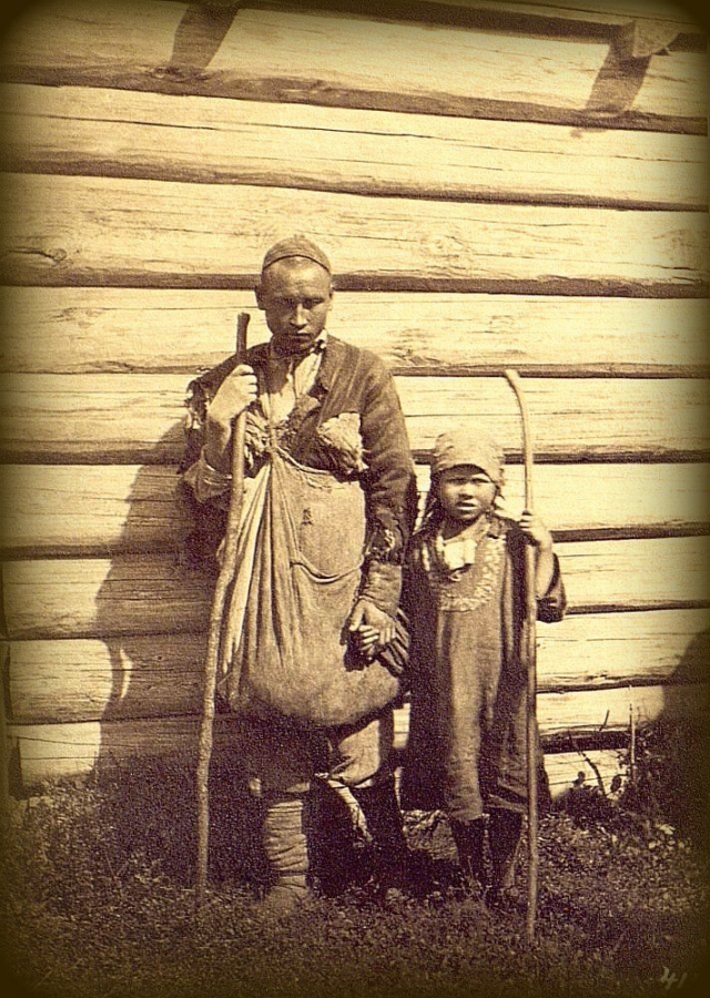 Бедняки в Симбирской губернии. На мальчике-подростке сума для подаяний: