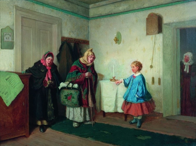 Вот-вот, к хозяину попрут серьёзные визитеры, и поэтому недовольно ковыряется в кошельке, стремясь поскорее откупиться от не ко времени явившихся «славильщиков».