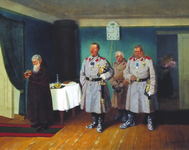 Леонид Соломаткин сам «закладывал за воротник» и, кажется, с особой симпатией пишет этих своих «товарищей по несчастью». У двух полицейских блестят на груди медали на Андреевской ленте в память о Крымской войне 1853 – 1856 годов, они участники боевых действий, причём у «командира отряда» есть ещё и Георгиевский крест, а в некоторых вариантах картины – и медаль «За спасение погибавших», вручавшаяся «За подвиги человеколюбия, с опасностью собственной жизни совершенные».