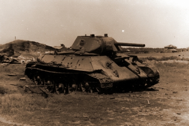 Подбитый танк Т-34 из состава 13-го танкового корпуса. Лето 1942 года: