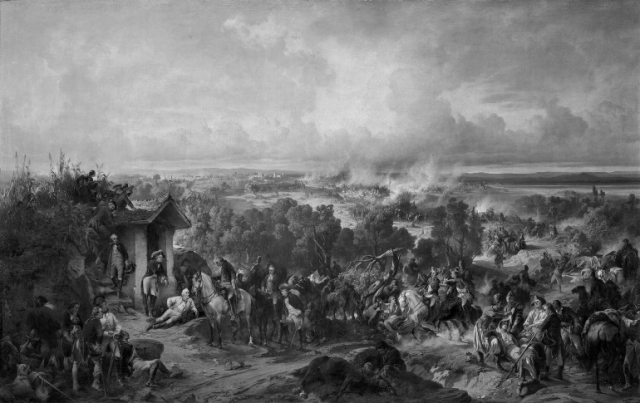 Битва при Треббии в июне 1799 года. Рядом с часовней в левой части картины лёжа на земле отдыхает Суворов. Якова Григорьева мы едва ли идентифицируем среди сражающихся: