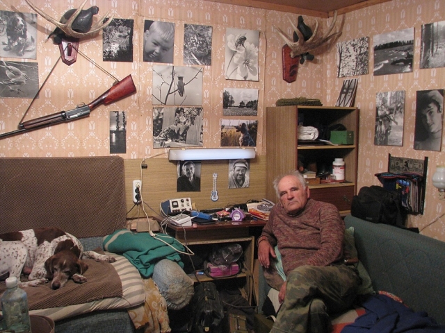 Игорь Лычкин в доме в селе Беклемишево, стены он украсил своими фотоснимками разных лет:
