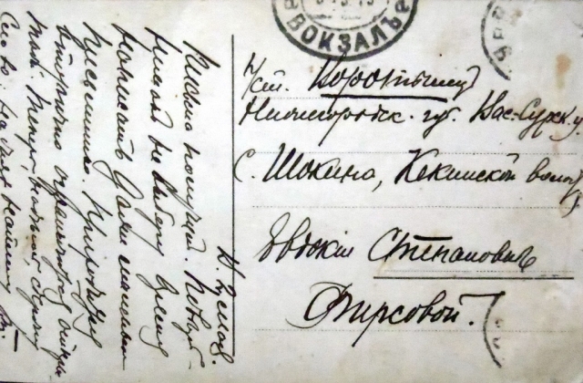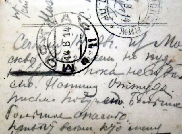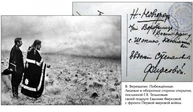 Наверное, редко писал солдат. Зато есть ещё одна открытка со штампом «Из действующей армии». На ней репродукция картины художника В. Верещагина «Побеждённые».