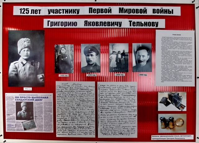 У меня дома хранится несколько трофеев, привезённых отцом, Григорием Яковлевичем Тельновым, с Первой мировой войны, – часы, бинокль, опасная бритва. Человек мирной профессии, лесовод, он больше тридцати лет работал в лесном хозяйстве.
