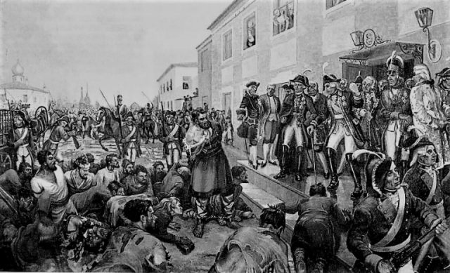 С крыльца на пленника взирали победители, царские генералы в усеянных орденами мундирах — а ведь многие из этих орденов появились только в послепугачевскую эпоху. На картине — не то поздняя весна или раннее лето, или ранняя осень. А ведь привезли Пугачева в Симбирск одного, без всяких соратников, 1 октября 1774 года, в праздник Покров с его первым снегом: «Батюшка-Покров, покрой землю снежком, а меня женишком». И народ специально подпускали поближе, чтобы публика видела, что перед ней никакой не царь Петр Федорович, под именем которого Пугачев возглавил свой бунт, а обычный — но не обыкновенный — мужик.