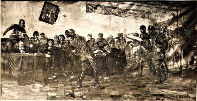 Анатолий Грошев. Расстрел главкома Муравьева. За столом, под покосившимся портретом Ленина, с пистолетом и шевелюрой — Иосиф Варейкис: