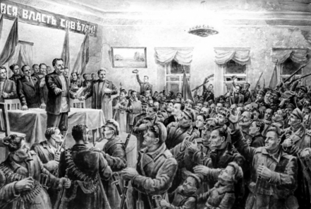 Лысый дядька с бородкой клином, Владимир Ленин провозглашает Советскую власть в Петрограде в Смольном 25 октября (7 ноября) 1917 года… Такова волшебная сила искусства, что мы верим в растиражированный образ, хотя на самом деле всё было иначе. Летом 1917 года законспирированный Владимир Ильич, называвший себя рабочим Николаем Ивановым, сбрил хрестоматийную бороду и нацепил парик на хрестоматийную лысину. Парик он в судьбоносный день скинул – но борода в один день отрасти, конечно же, не успела. А на картинах советских художников и в кинокартинах советских режиссёров Ильич с бородой! И поди, докажи теперь: лучше – да и легче – один раз увидеть, чем сто раз услышать.