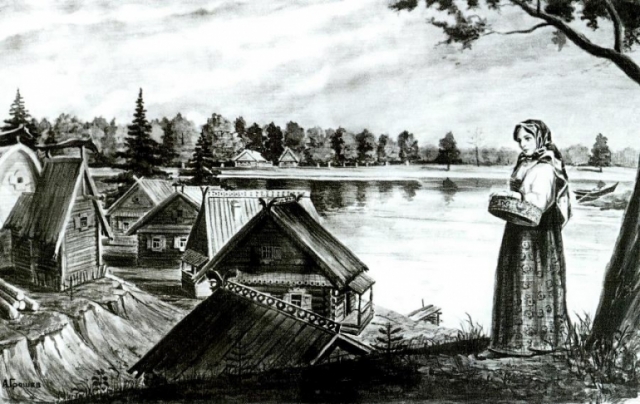 Молодая миловидная женщина в платке и цветастом сарафане держит в руках расписанное берестяное лукошко, стоя на фоне водоёма и нарядных деревянных домиков – такова «Маришка», изображённая Анатолием Николаевичем. Без подписи, по одному только изображению сложно сделать вывод о легендарной любовной драме, до сей поры запечатлённой в ульяновских городских топонимах: мы не видим ни красавца-любовника, ни самой попытки утопления.