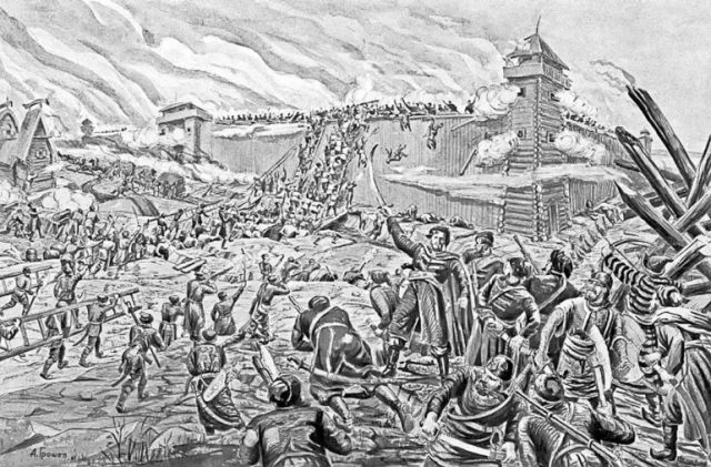 Может, и к лучшему — а то что это за «трепещущий в смертельном страхе воевода»? Князь Юрий Никитич Барятинский, с малыми силами отбивший первый натиска Разина на Симбирск, а через месяц наголову разгромивший его? Или князь Иван Богданович Милославский, выдержавший месячную осаду Симбирска, в 1671 году покоривший город Астрахань, последний оплот разинцев?.. Зато батальная сцена выразительна. И пусть это тоже фантазия художника, зато редкая научно-популярная публикация о Крестьянской войне под руководством Степана Разина теперь обходится без неё.