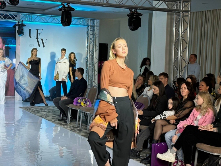 На подиум вышли модели, которые продемонстрировали корсеты, платья, платки, жакеты, блузки и бомберы, на которых изображены картины известного в России художника.