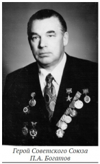 После войны капитан запаса П.А. Богатов вновь сел на студенческую скамью, но уже в Московском горном институте, получил диплом инженера, много лет работал в проектном институте «Центр гипрошахт». На родину в Старое Никулино он после 1946 года не приезжал, там у него почти никого не осталось. А вот в Карлинской школе побывал ещё раз, осенью 1977 года. Походил с волнением по классам, в музее рассмотрел старые фотографии, встречался с ребятами и учителями, говорил, как многим обязан школе. На снимке, тоже уже старом, видны неподдельная радость школьников и виновника торжества. Ребятам было о чём расспросить Героя-земляка, а тому было что сказать.