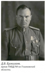 Жизнь резко изменилась после армии. Три года – с 1931 по 1933 – Дмитрий Ермолаев служил в столице, в Московской пролетарской стрелковой дивизии, где стал коман‐ диром отделения 3 стрелкового полка. После демобилизации вчерашний красноармеец вернулся домой и вскоре поступил на службу в Нижне‐Ломовский районный отдел милиции Пензенской области. Затем 2 года учился в куйбышевской областной школе среднего начсостава милиции, по окончании которой работал сначала в областном управлении НКВД, а затем, в 1938 г. был направлен в Ульяновск оперуполномоченным второго отделения городской милиции, которое спустя год и возглавил. Вся дальнейшая служба Дмитрия Васильевича проходила в нашем городе, вплоть до выхода на пенсию по выслуге лет 5 февраля 1958 г. (Архив УМВД по Ульяновской области. Личное дело Ермолаева Д.В.)