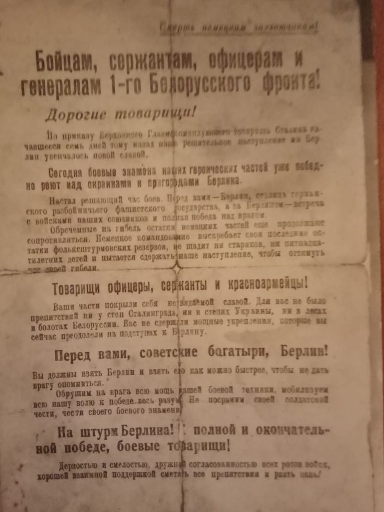 — Особенно туго пришлось во время Берлинской операции. Шли кровавые бои за каждую улицу, каждый дом. Свистели пули, но он выполнял задачу. Уже в Германии ему приснился сон, что он змею победил. Ему растолковали значение — это знак, что домой вернётся живым, — сдерживая слёзы, говорила Елена Юрьевна.