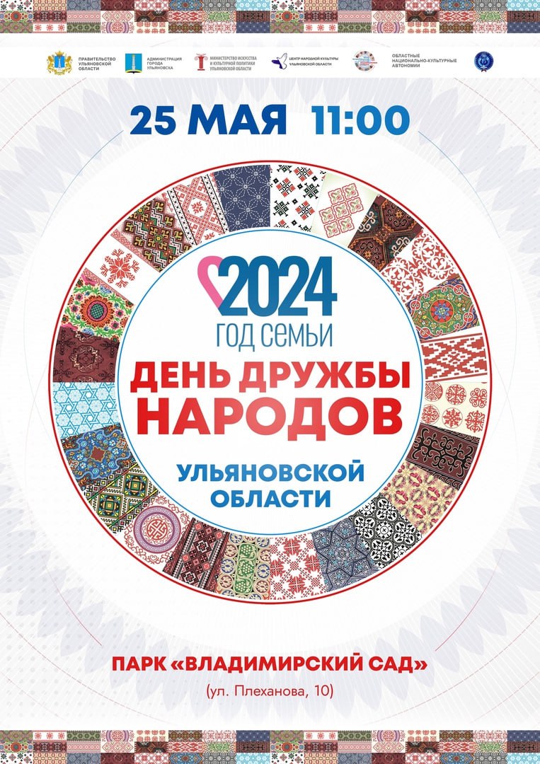В этом году празднование Дня дружбы народов приурочено к Году семьи в России. Жителей и гостей Ульяновска ждут различные этно-площадки: «Семья мастеровая», «Дружное детство», национальные игры, «Музыка и танцы народов» - театрализованное представление «Жили-были...», а также площадки «Будь здоров!», «Сказки на все времена» и «Победа будет ZA нами!».