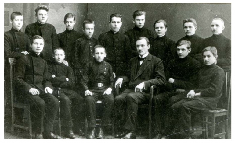 Учащиеся Вольмарской учительской сем инарии. Янис Стен второй слева в верхнем ряду. 1915 или 1916 год: