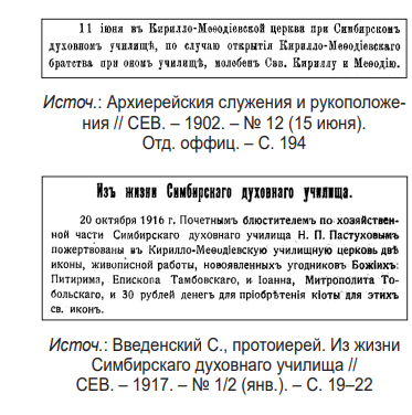 - (10) см.: Отчет Православнаго Кирилло-Мефодиевскаго Братства при церкви Симбирскаго духовнаго училища за 1902 год // СЕВ. – 1904. – № 9 (1 мая). Отд. оффиц. – С. 117.