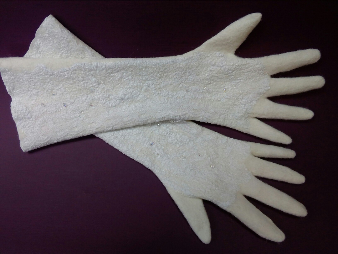 Другие митенки изготовлены из белого трикотажного ажурного полотна с растительным рисунком. На тыльной стороне – ветки с цветами на сетчатом фоне, плодами и листьями из плотного трикотажа, на ладони – мелкие трилистники на сетке.