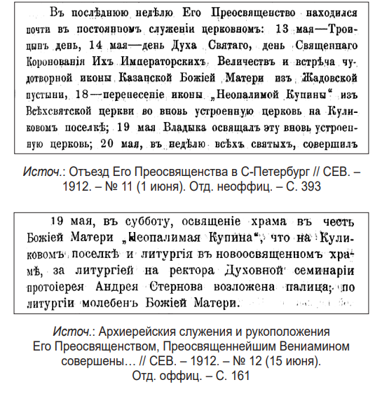 «В последнюю неделю Его Преосвященство находился почти в постоянном служении церковном <…> 18 (в пятницу 18 [31] мая 1912 г. – В. Я.) – перенесение иконы «Неопалимой Купины» из Всехсвятской церкви во вновь устроенную церковь на Куликовском поселке…» (14) .