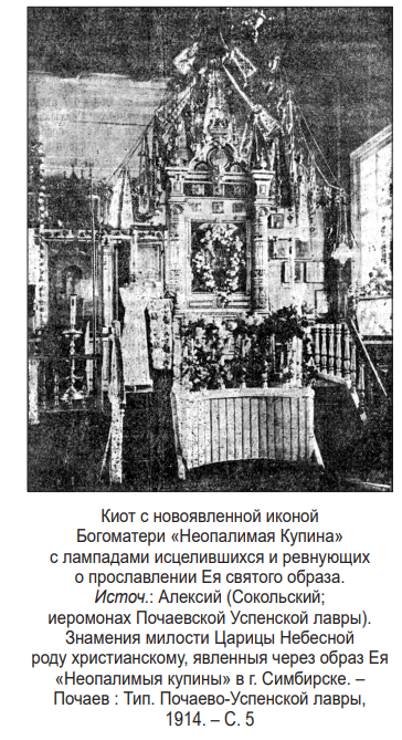 - (23) см.: Алексий (Сокольский; иеромонах Почаевской Успенской лавры). Знамения милости Царицы Небесной роду христианскому, явленныя через образ Ея «Неопалимыя купины» в г. Симбирске. – Почаев : Тип.Почаево-Успенской лавры, 1914. – 32 с. – (Библиотека Волынского с[оюза] р[усского] н[арода]; № 24).