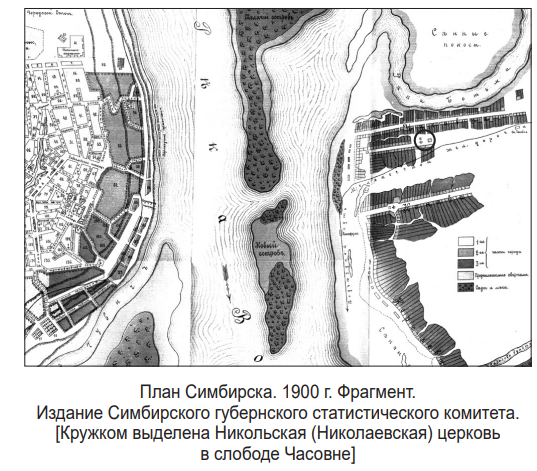 Никольская (Николаевская) церковь была построена в слободе Часовне в мае 1909 г. Хотя место «с назначением церкви на углу в площади» по плану работавшего в России шотландского инженера и архитектора Вильяма (Василия Ивановича) Гесте (Эсти) (англ. William Hastie, 1753 (или 1763) – 1832) было определено ещё в 1814 г. (1) А летом 1891 г. на заседании Симбирской городской думы от 21 июня было принято постановление «Об отводе места в слободе Часовня» (2). При этом стоит иметь в виду, что до 1849 г. слобода Часовня своим приходом принадлежала к Смоленской церкви, в 1849–1909 гг. – к Казанской церкви в слободе Канаве.