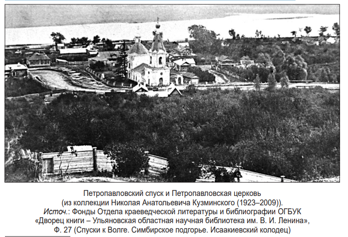 - «К тому ж и весьма частые родники из оной истекают, от чего в 743 году (имеется в виду 1743 г. – В. Я.) столь много с своего места тронулась, что две каменныя церкви повредило, обывательское же поселение, состоящее под сей горой, коего весьма не мало некоторыя переломало, а протчия совсем переиночило…» (источ.: Зерцалов, А. Н. Краткий историко-географический очерк Симбирска, Сызрани и Кашпира во второй половине XVIII века. – Симбирск : Типо-литогр. А. Т. Токарева, 1896. – С. 7). Можно уверенно предположить, что под «двумя каменными церквями» имеются в виду Смоленская (→) и Петропавловская церкви. Смоленская церковь (→) в 1751 г., ещё после нескольких оползней и просадок почвы на Симбирской (или Волжской) горе, была перенесена выше, на Смоленский спуск (ныне склон (спуск) без названия с садовыми участками от ул. Рылеева к р. Волге).
