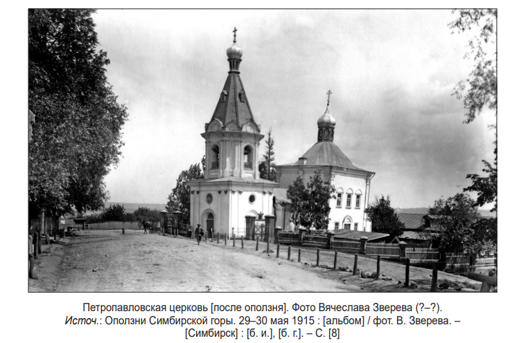 «Прихожане симбирской Петропавловской церкви, лишившись возможности удовлетворять свои духовно-религиозныя нужды в разрушенном оползнем Подгорья приходском храме, в настоящее время озабочены постройкою, по примеру прихожан симбирской Смоленской церкви, временнаго деревяннаго молитвеннаго дома. Высокопреосвященнейший Вениамин, архиепископ симбирский, глубоко скорбя о постигшем петропавловцев тяжелом несчастье, архипастырски приветствует это благочестивое решение прихожан, выразив при этом свое искреннее желание, чтобы проектированный молитвенный дом был построен к великому христианскому празднику Св. Пасхи будущаго1916 года (в 1916 г. Пасха праздновалась в воскресенье 10 [23] апреля. – В. Я.), что умалило бы печаль несчастных петропавловских прихожан и усугубило в пресветлый день торжества церкви Христовой, а равно и каждаго верующаго человека, духовную радость воскресшем Жизнодавце (37)!..» (38).