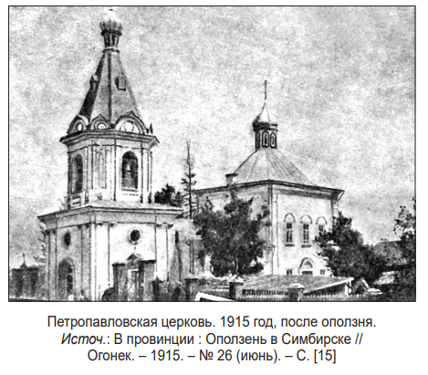 - см.: Отголоски оползней Петропавловской горы : [в результате оползня колокольня церкви отклонилась от трапезы] // Волжские вести. – 1915. – 2 июня (№ 1785). – С. 3.