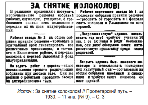 35. За снятие колоколов! // Пролетарский путь. – 1930. – 11 янв. (№ 9). – С. 3.