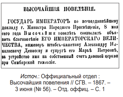 «Государь Император, по всеподданнейшему докладу г. Министра Народнаго Просвещения (9), 8 мая 1867 г., Высочайше повелеть изволил: объявить благоволение Его Императорскаго Величества инженер штабс-капитану Александру Денисову и супруге его Марье Петровне, за устройство ими на собственный счет домовой церкви при Симбирской гимназии» (10).