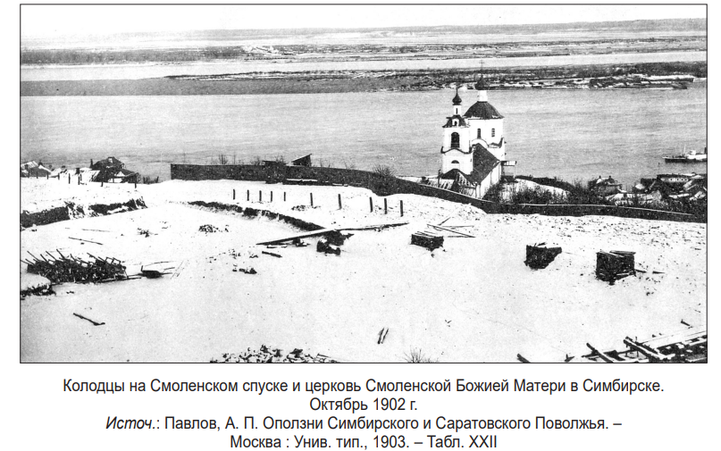 10. Смоленская церковь // Аржанцев, Б. В. Архитектурно-исторические образы Симбирска :(монография). – Изд. 2-е, испр. и доп. – Ульяновск : Печатный двор, 2004. – С. 59–60. Колодцы на Смоленском спуске и церковь Смоленской Божией Матери в Симбирске.Октябрь 1902 г.Источ.: Павлов, А. П. Оползни Симбирского и Саратовского Поволжья. –Москва : Унив. тип., 1903. – Табл. XXII373