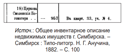 - см.: Общее инвентарное описание недвижимых имуществ г. Симбирска. – Симбирск : Типо-литогр.Н. Г. Анучина, 1882. – С. 100.