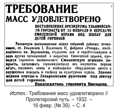 - см.: Требование масс удовлетворено : Постановление президиума Ульяновского горсовета от 15 февраля о передаче Смоленской церкви под школу для детей горняков // Пролетарский путь. – 1932. – 16 февр.(№ 39). – С. 4.