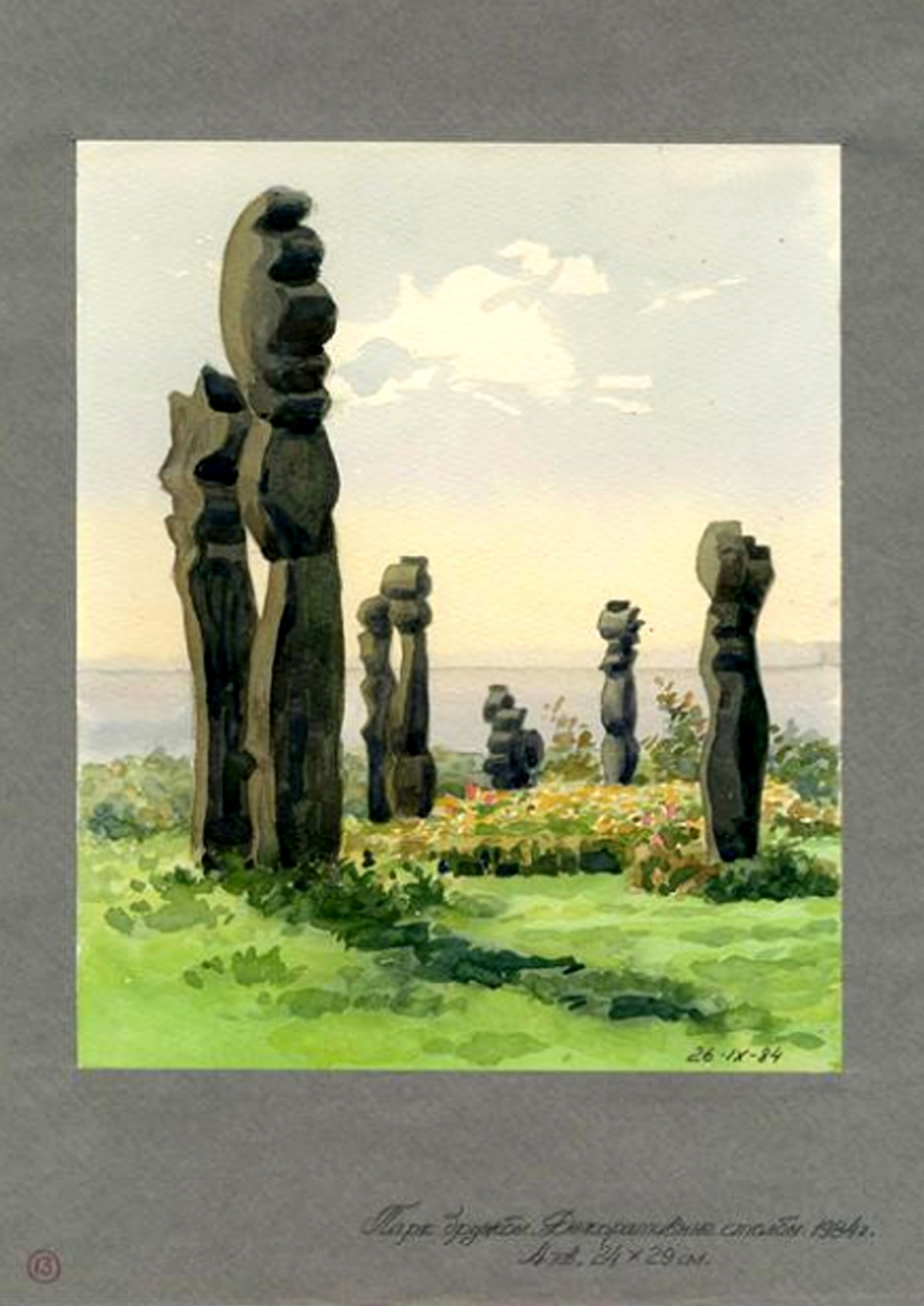 Участок Литовской ССР в Нижнем парке. Акварель А.И. Титовского «Парк дружбы. Декоративные столбы». 26 сентября 1984 г.: