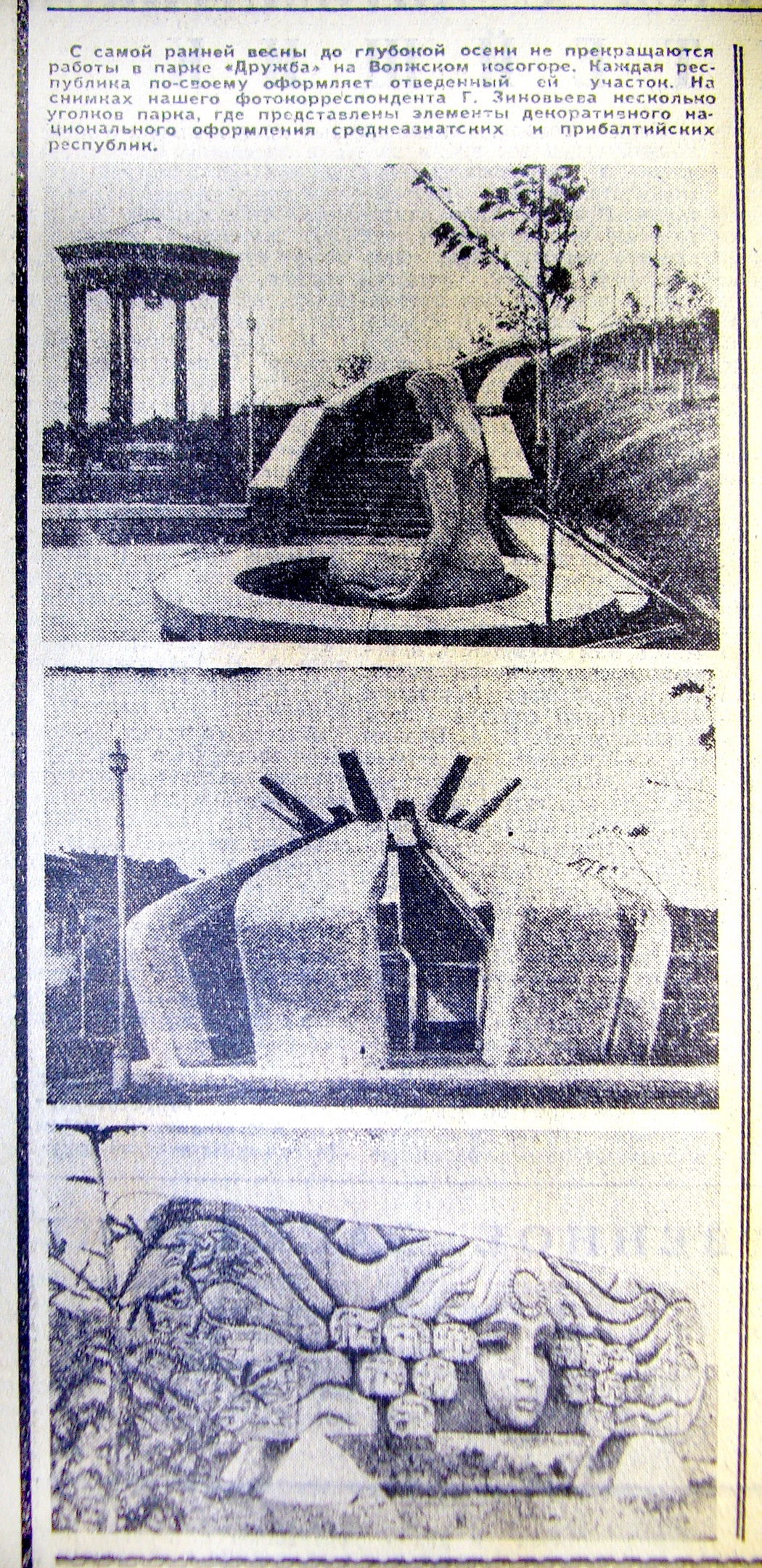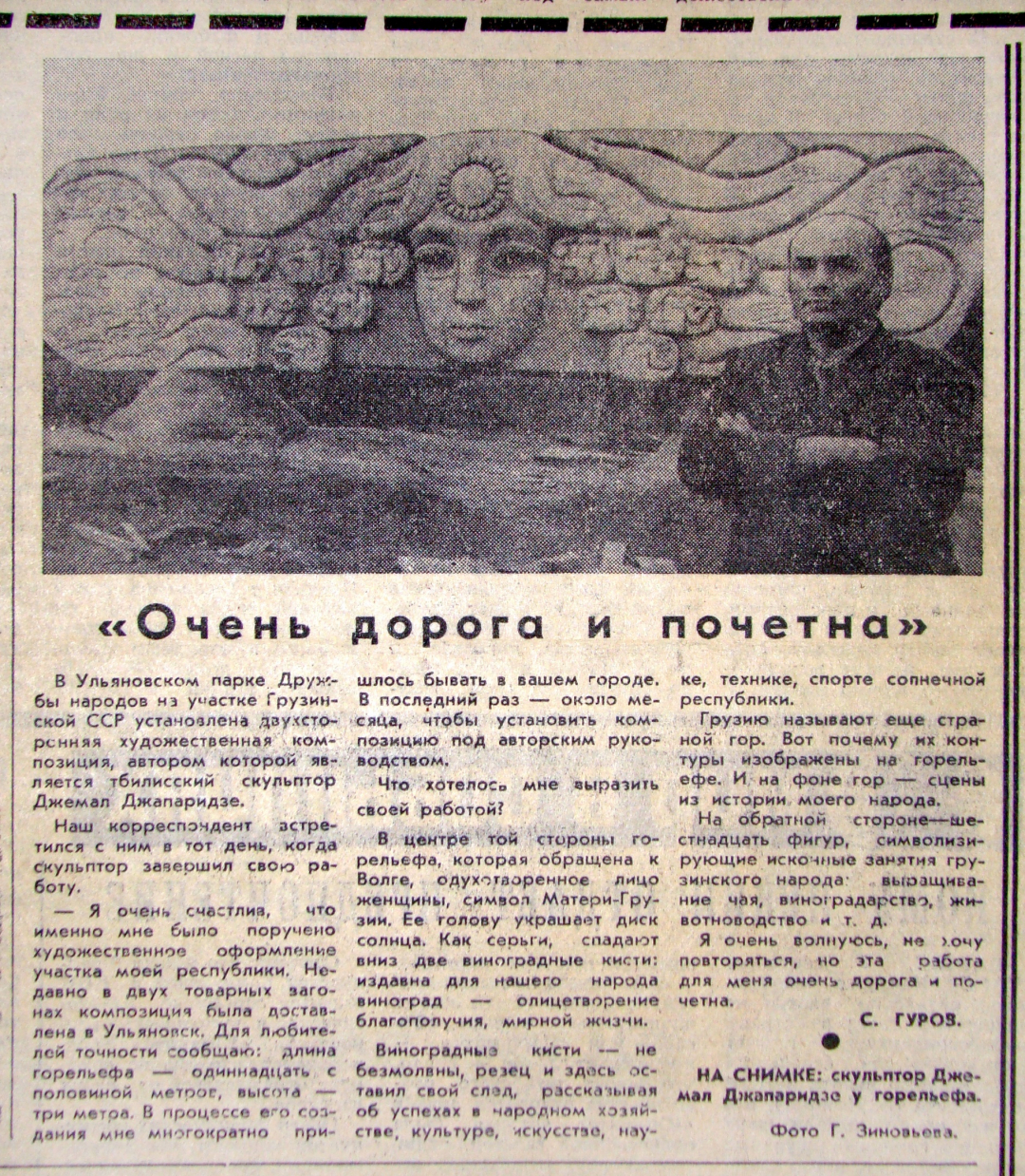 Публикация С. Гурова «Очень дорога и почётна» о работе скульптора Д.А. Джапаридзе над рельефом на участке Грузинской ССР в Нижнем парке. «Ульяновская правда», 9 сентября 1973 г. Фотограф Г.А. Зиновьев: