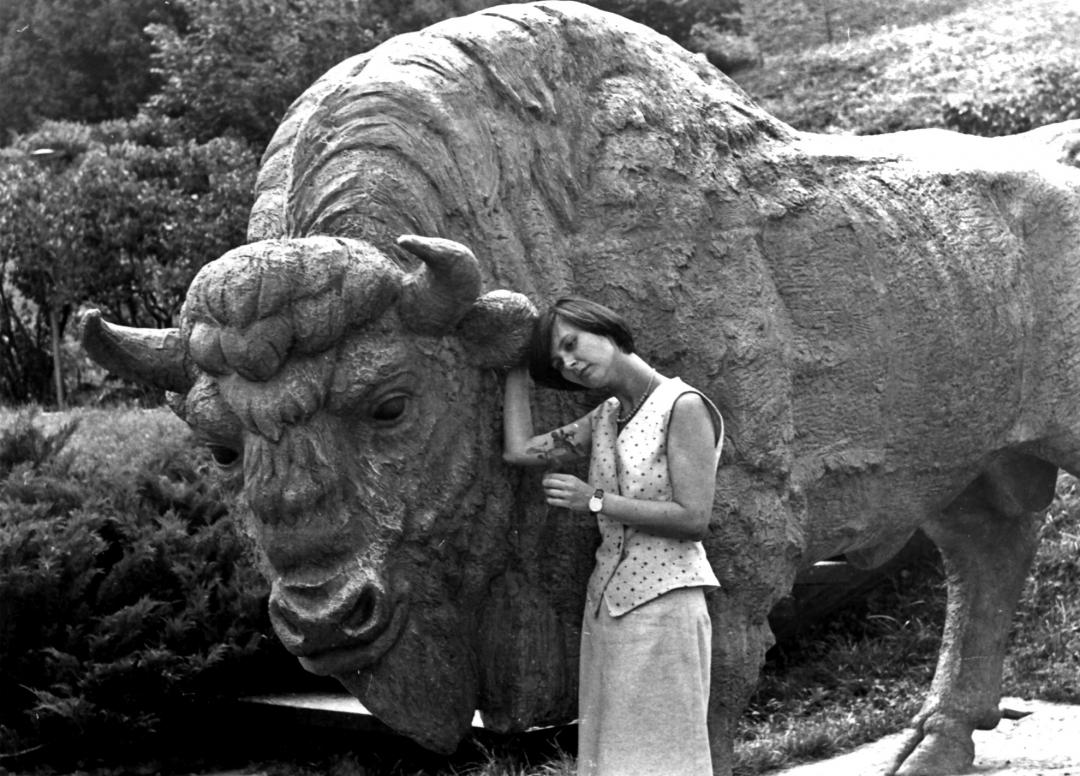 У скульптуры зубра на участке Белорусской ССР в Верхнем партере. 8 августа 1994 г. Фотограф А.Ю. Шабалкин: