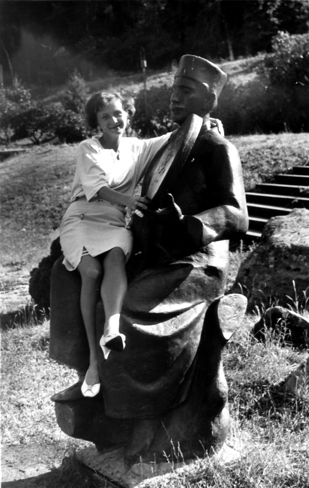 На скульптуре джигита с бубном на участке Азербайджанской ССР в Верхнем партере. 16 июня 1995 г. Фотограф А.Ю. Шабалкин: