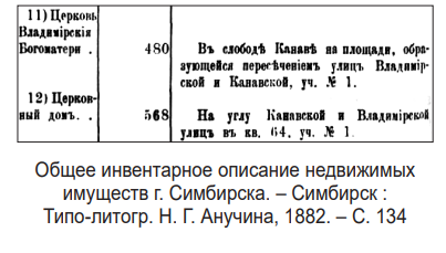 - см.: Общее инвентарное описание недвижимых имуществ г. Симбирска. – Симбирск : Типо-литогр.Н. Г. Анучина, 1882. – С. 134.