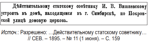 4. Разрешено: …Действительному статскому советнику И. В. Вишневскому устроить в доме,находящемся в г. Симбирске, по Покровской улице домовую церковь // СЕВ. – 1895. – № 11(1 июня). – С. 159.