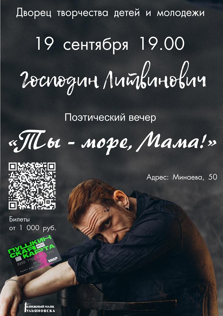 19.00 — «Ты море, мама!», поэтический вечер Господина Литвиновича (Москва).