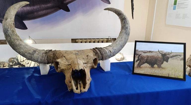 Это череп с сохранившимся роговым покровом рогов ископаемого бизона, проживавшего 2,5 - 0,7 миллионов лет назад, и нижняя челюсть шерстистого носорога, исчезнувшего 14 - 8 тысяч лет назад. Череп этой же особи уже есть в коллекции музея.