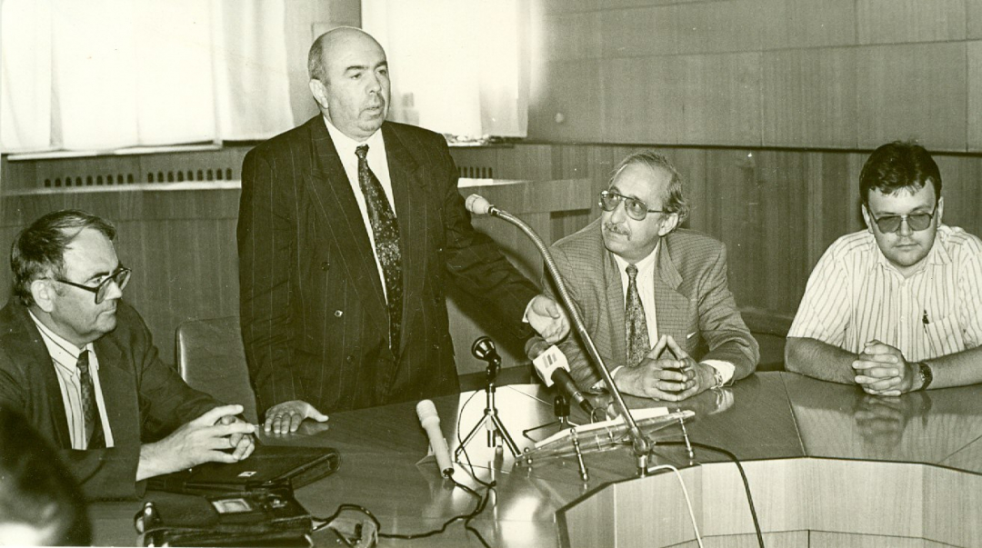 Заместить главы администрации Ульяновской области Виктор Тигранович Чая и генеральный директор греческой фирмы Паскалис Паскалидис на пресс-конференции, посвященной строительству моста через р. Волгу в Ульяновске. 1996 г. ГАНИ УО Ф. 5968 Оп.1. Д. 1433