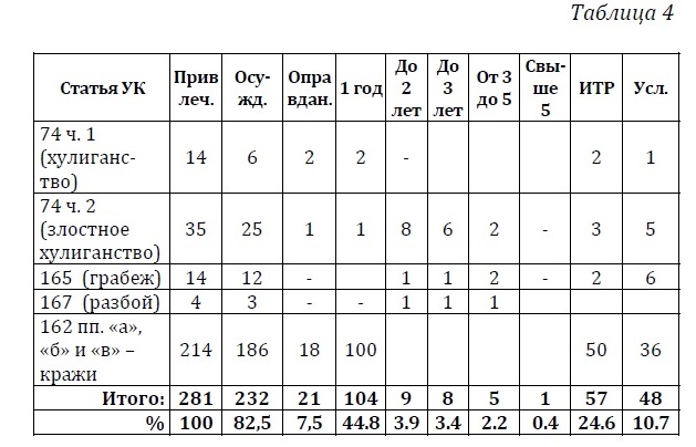 Какие выводы можно сделать из анализа приведенных в таблице 4 данных? Во‐первых, в ней по‐прежнему отсутствует такой раздел, как убийства. Это значит, что количество этих преступлений по‐прежнему было крайне незначительным. Во‐вторых, судебная практика, как и год назад, оставалась вполне либеральной. Достаточно сказать, что из 12 осужденных за грабежи к реальному лишению свободы были приговорены всего четверо (33%). А из 4 представших перед судом разбойников 1 был оправдан. Из 31 человека, осужденного за хулиганство, реальное лишение свободы получили 19 (61%).