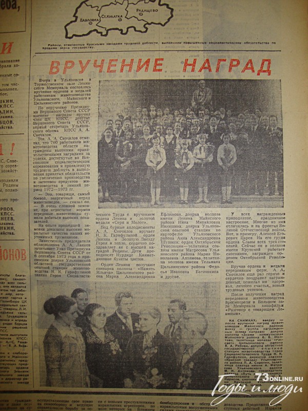 По поручению Президиума Верховного Совета СССР высокие награды вручил член ЦК КПСС, депутат Верховного Совета СССР, первый секретарь Ульяновского обкома КПСС А.А. Скочилов (…)